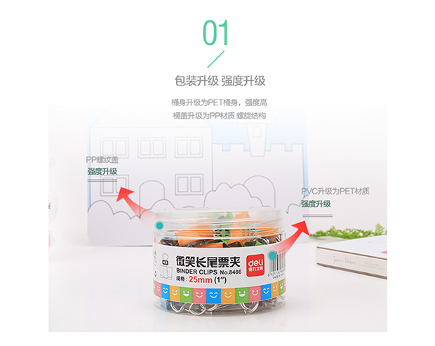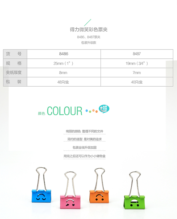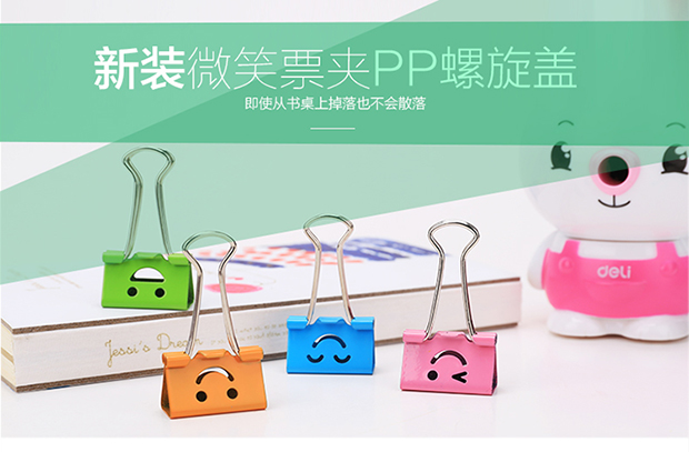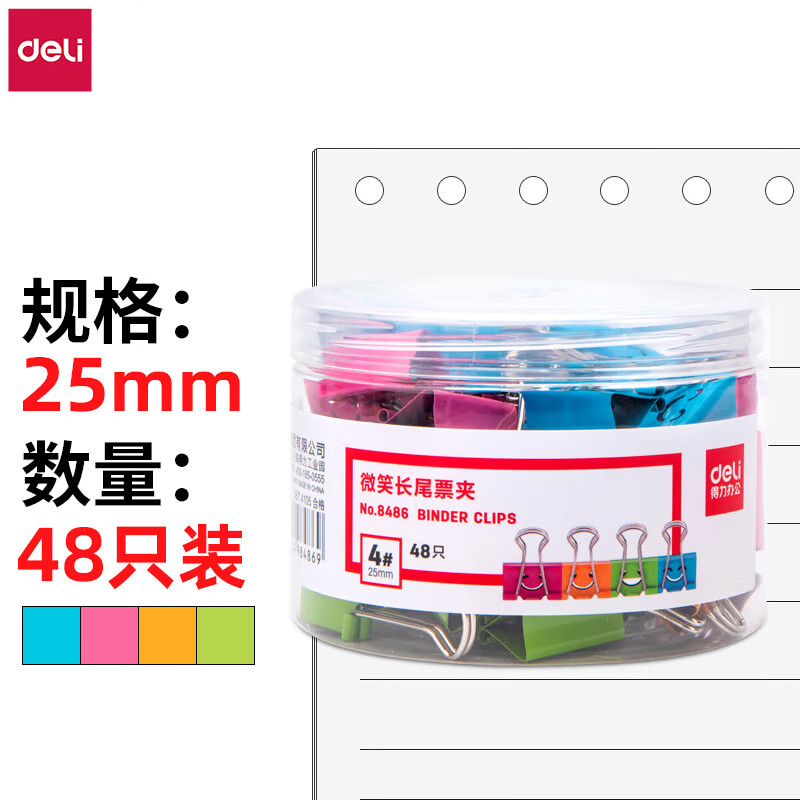 得力8486微笑系列长尾夹 4#25mm 彩色 48只/筒