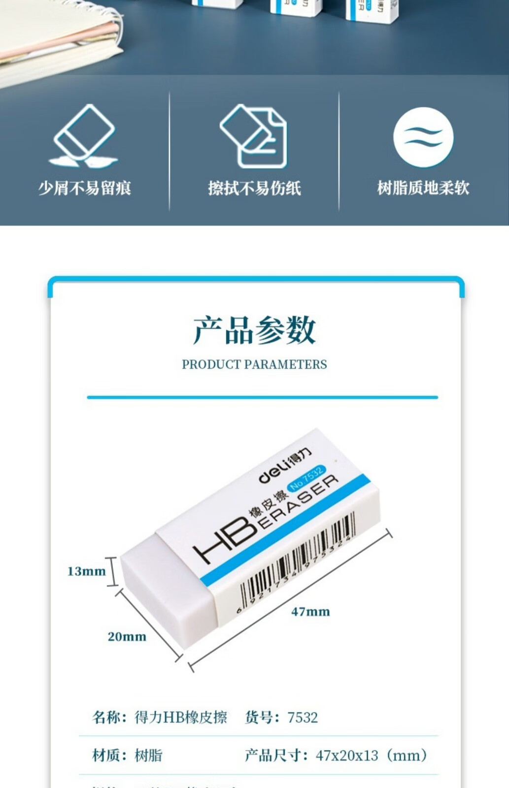 得力7532学生HB橡皮擦 白色 单块装