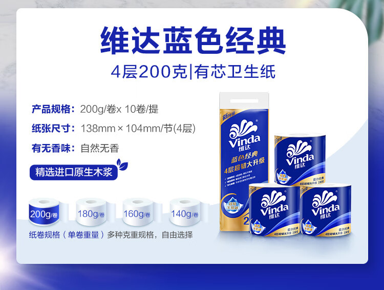 维达卷纸 蓝色经典卷纸 4层200g 10卷/提 V4073
